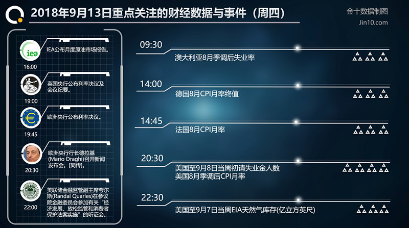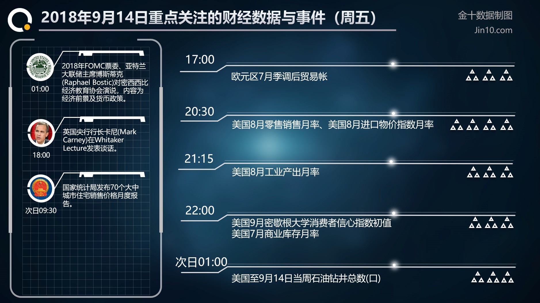 周四,美国通胀数据爆冷美元跌至新低,黄金一度上破1212关口,但随后上演大跳水,回吐日内涨幅;欧佩克产量创逾9个月新高,美布两油终结上涨势头;德拉基鹰派发言提振欧元,英国同意脱欧关键细节,英镑应声上涨。 展望今日,美国“恐怖数据“重磅来袭,美元或再遭打压;卡尼讲话引发市场关注,脱欧风险久久不散,小心英镑再现短线波动;石油钻井总数明晨公布,昨日惨败的原油多头能否打好这场翻身仗? “恐怖数据”今晚登场美元或再遭打压 周五晚间20:30,美国将公布8月零售销售月率,预期为0.4%,前值为0.5%。同时公布的还有8月进口物价指数月率,预期为-0.2%,前值为0%。晚些时候还将公