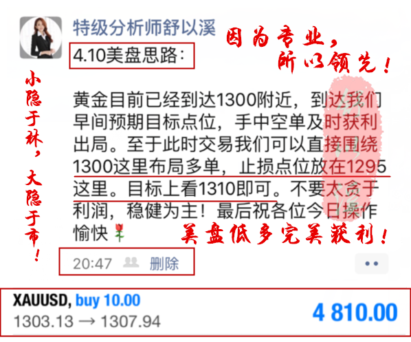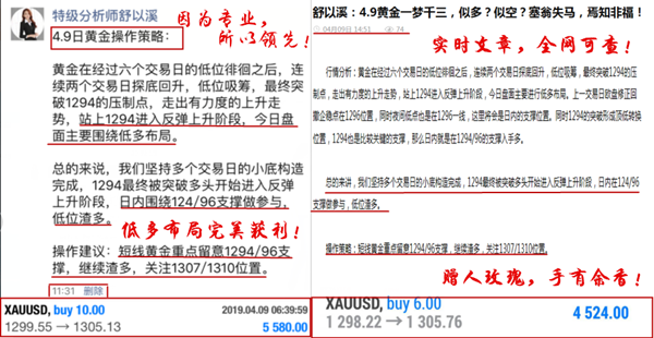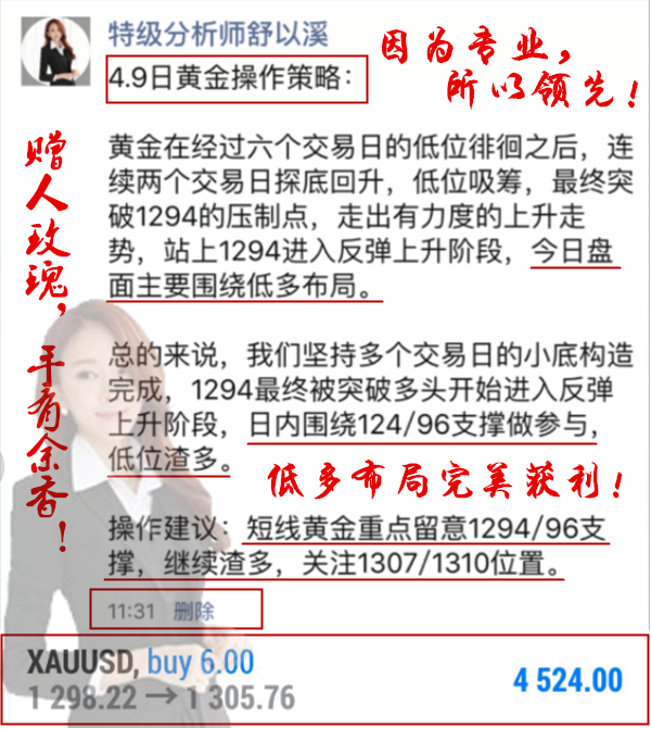 小桥流水,乃天籁之声!心若无澜,便碧海晴天!市场风云,有锦囊妙计!赠人玫瑰,可手留余香!十年风雨,同舟共济~我是舒以溪,一个愿赠你玫瑰的友人! 世人笑我太疯癫,我笑世人看不穿!生旦净末丑,戏里戏外,刻画得入木三分。 昨天操作方面以溪没有尽到完美,但是以溪任然是大展宏图。亚欧盘以溪在破位1295后开始布局多单,在经过一段时间的横盘后美盘上涨至1300附近获利出局,但是这一波操作以溪小看了这波涨幅,黄金直接上冲至1303附近,不过黄金冲至1303附近后明显冲势不足,而且1303这里是压力集中地带,这时以溪及时调整思路,在1303这里布局高位空单,最后行情也正是如以溪所料,如期进行了回调,空单也是
