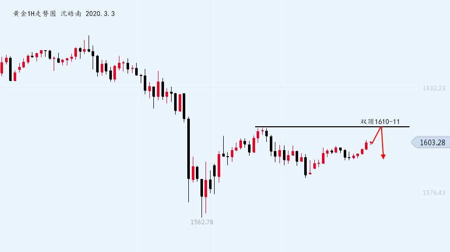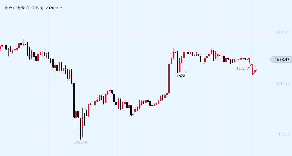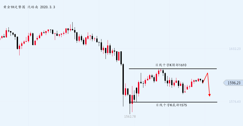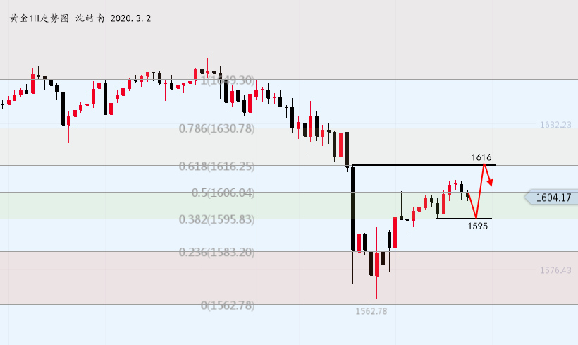 有个护士朋友,已经在一线奋战了整整一个月,意味着与她的儿子分开了一个月,每天医院和酒店两点一线,虽然苦,虽然累,虽然有着感染的风险,但她说,儿子不在旁边,就没有人打扰她看李佳琦的直播,还挺乐观的,希望大家早日凯旋。 关于黄金,我们周评文章《沈皓南:疯狂!黄金一周跌127点,下周关注1595压制继续空》中有提到一点,如果今天午后1-3点价格持续被压制在1595之下,那么可以选择直接做空,看欧盘破位1562底。 但,很不幸运的是,黄金并没有按照写好的剧本走,今日早盘低开高走,直接突破了1595,这个位置是周五凌晨盘反抽高点,这里破位,就说明今日并不是极弱,那就不能按照极弱的思路做空黄金。 既然不
