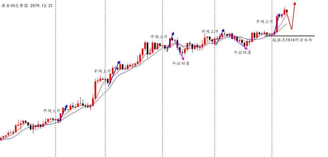 2019年最后一天,2019年最后一篇日内点评,简单聊聊。 周一,黄金的走法和上周五如出一撤,早间上升,午后回落,欧盘盘整,美盘上涨,节奏属于极慢的那种。 另外,有一点需要特别注意,今日早间再次上涨破高,和最近几个交易日一样,都属于早间上涨,高点就这样不断的被刷新。 上涨行情中,早间上升的行情,特别是在破高的情况下,显然是需要继续看多的,要注意的是,虽然继续看多,但不太建议直接高位追多,因为刚才有提到,一个是午后会有回落,一个是欧盘盘整,这两个是近日走势给出的信号。 下方关注一个位置就是1514,这里是今日早间起涨点,只要这里不破,一切的回调都是给到多单上车的机会,按照最近慢涨的节奏,今日还