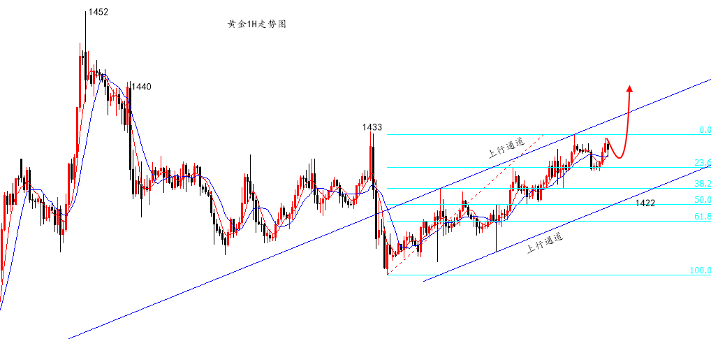 真心佩服今日头条和抖音的推荐机制,你对什么感兴趣,它就专门给你推荐什么,比如我吧,几十年来,一直很喜欢古天乐,最近刷古仔,今日头条就给我推荐关于他捐钱建学校的事情,抖音就推荐他的电影《扫毒2》和《使徒行者2》,全是他的新闻。当然,如果你看的是黄金新闻,它们也会给你推荐,哈哈。 周二,黄金的波动不算很大,最低1422,最高1433,11个点波动于近期而言算是比较常见,亚盘下跌,午后盘整,欧盘依托1422慢涨,美盘6美金波动。 隔夜,具体来说应该是凌晨2:00,黄金价格到底还是起来了,最终触及前期高位1433的位置,我们根据“降息预期”以及“博日线连阳”安排的1427-26多单,终究还是达到了目