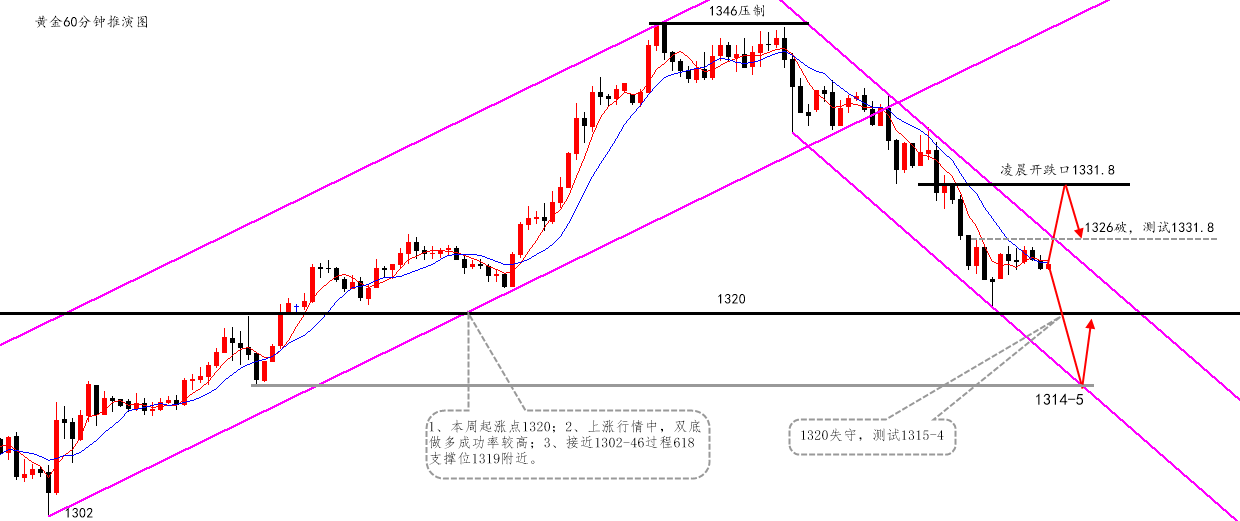 时间不早了,就简单说两句。 黄金方面,昨日几乎没有任何人能够想到价格会从1341跌到1320,周二大涨20美金历历在目,周四立刻打回原形,有人欢喜有人忧。 但并不是说,多头要转空头了,理由我只给出一个, 上涨行情中,前一次起涨点未跌破之前,不能定义为转势。 前一次起涨点位于1302,这将是下周重点关注的防守位置。 同时,1346承压下跌,因为日线目前二连阴,加上此前从1160上涨至1346,幅度达186美金,其实已经进入了风险区域,为了谨防转势,那么这个时候要做多的一定要记得轻仓操作,另外该止损就得止损,一旦转势,解套要等明年这个时候。 暂时没有长线安排,继续关注短线。如黄金60分钟走势图所