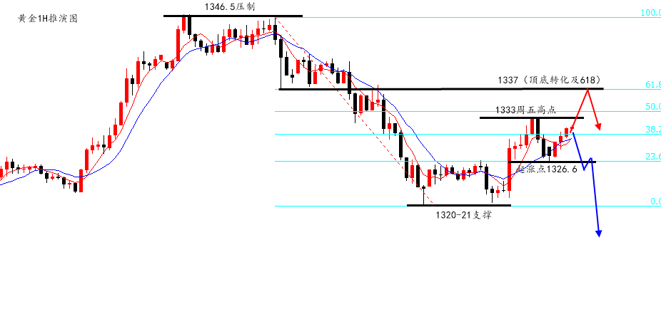 黄金,二连阴后,周五收小阳,今日很关键,收阳则多头修正可能性大,后续有机会创新高;收阴,继续回调可能性大。 今日,早间上升,中间位置,做多,承压周五高点1333,担心压制;做空,早间上涨,下方没空间不大。很尴尬,建议亚盘先观望。 若1333突破,则会继续向上测试1346.5-1320过程618阻力1337附近,这个位置是比较适合做空的;另外,如果起涨点1326.6失守,反抽直接做空即可。 日内暂时不做多,因为即使周五高点1333突破,距离1337太近,空间并不大,而且早间上升的走势一般延续性不太好。操作上建议做空为主,两种方案: ①突破1333,在1337附近空,止损1342,目标1327-