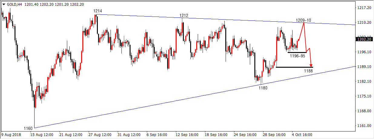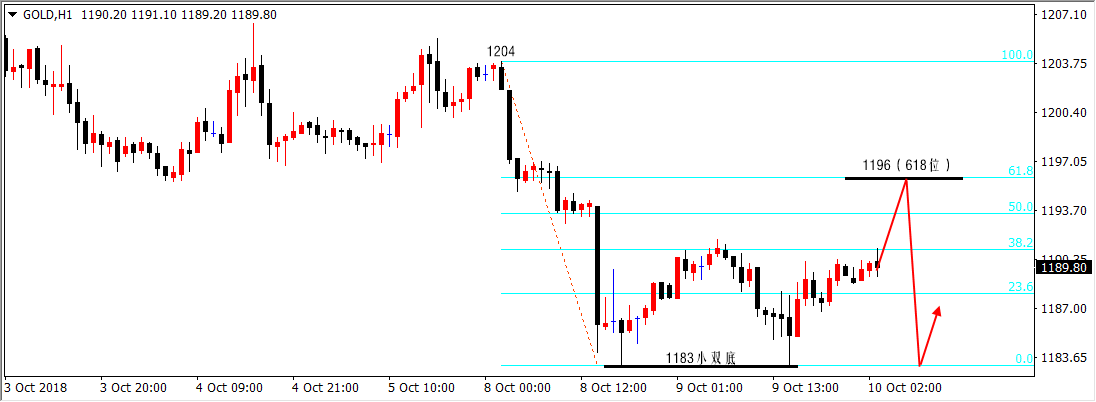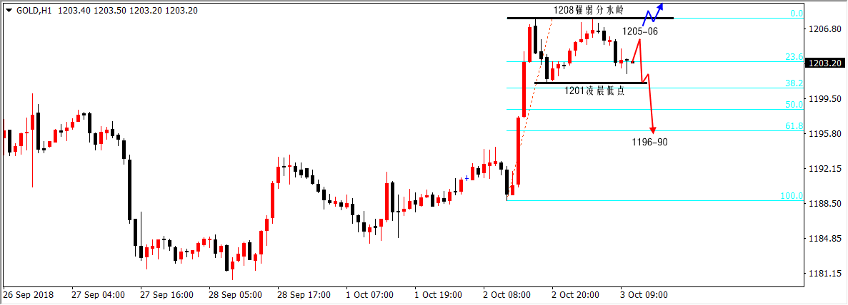 时间如流水,仿佛转瞬间,中秋刚过去,国庆又来了,2018年就这样渐行渐远,琳琅满目的月饼,处处假期的氛围,中秋是与家团聚的日子,国庆是普天同庆的节日,双节到,这是一年即将结束的预兆,国庆,祝福假期玩的开心,祝愿之后过的舒心! 上周,黄金“终于走出”了为期一个月的箱体震荡1214-1183,特别是上周四大阴杀跌破位1183之后让我们看到了空头再下一城的决心, 当上周五白盘创下1180新低之后更加坚定了这份信念,遗憾的是美盘强势上涨1193给气势如虹的空头浇了一盆冷水。 用“终于走出”来形容1214-1183区间破位是有原因的,因为在下探1180之后本周黄金价格又强势上涨至1208的位置,所以,