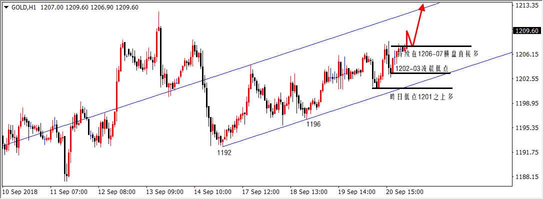 大家下午好!很抱歉,由于早间忙于公司第三季度总结会议,早评未能及时更新,不过刚才看了一下,还是反复震荡的行情,不操作也罢,下面陆离简单分析接下来的布局。 周二,黄金继续震荡,亚盘向下测试了一次1195支撑,美盘向上测试了一次1203阻力,多空均没有良好延续性,日线报收小阴,震荡的范围越来越小,迎来破位的概率越来越大。 今日,价格平开高走,尤其是午后依托1198连阳上涨,更致命的是有效突破了昨日高点1203,按照这样不回撤的强势走法,欧美盘还将继续测试向上测试阻力,重点关注1208、1212、1214位置。 下方的话,则重点关注昨日低点1195支撑,95不破向下的空间就打不开,同样,1214不