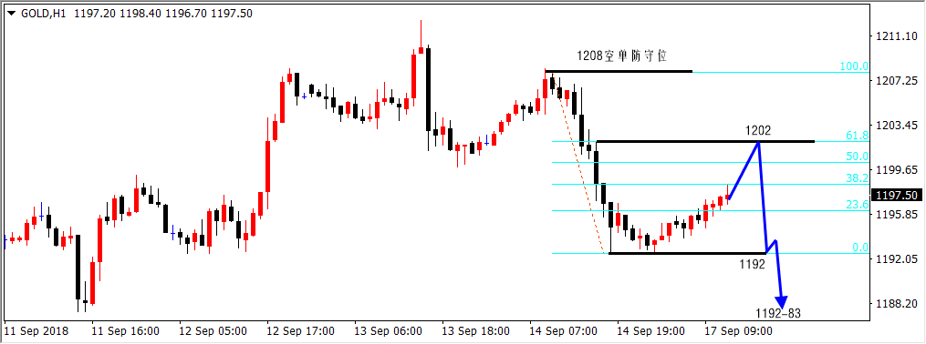 简单回顾一下上周五行情。 黄金,美盘时段自1208高位回落,凌晨延续下跌1193收盘,日线报收倒垂子阴线并在两连阳之后连阴,很明显的震荡走法,9月16日周评文章《陆离解盘:黄金盘整酝酿下跌,下周1208之下空;原油67.92以上多》也明确表达过1214-1183区间震荡的观点。 今日,价格依托1192慢阳上涨至1197,波动虽不大,但我们可以从中得出一点结论, 欧盘未能二次下跌,代表行情非极弱,美盘将继续震荡 ,那么日内以弱势观点在凌晨高点1197安排的空单保守则需要调仓出局,这是对错处理的方式。 既然看震荡,美盘首先要做的就是不能追多,谨防追涨;其次,需要重新找位置做空,周评提及过618位
