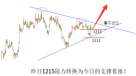 昨日美指延续偏强震荡,日线再收得一阳,承压后的黄金尾盘回落,随后有所回弹测压1215附近,日线最终收得一中阴。下方回撤的低点抵达1212,但是盘中的运行节奏与预期还是有出入的,这也就给操作上带来一定的麻烦。按照目前日线结构,昨日阴线贯穿下跌,技术上今日大概率会反弹承压回落,这是最近常常出现的区间走势。在昨日大跌后,市场多头情绪也会受到一定的损伤,所以短期反弹能够重新拿回1220,那么就当作探底回升,向上发力的力度就会大大加强,而若不能重返1220之上,那么就当作底部区域的震荡,不能当作极弱来对待。 近期多次冲击1230未能突破,久攻不破必然走回落,这种趋势回落只是上升的折返,是修正形态,不是