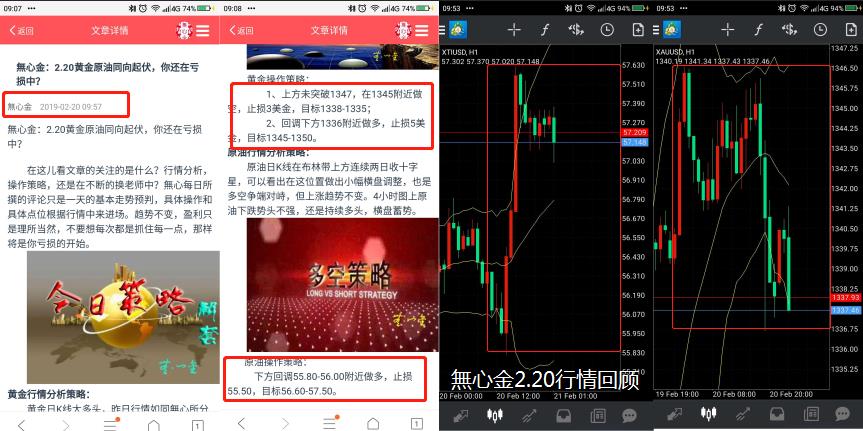 無心金:2.21黄金原油双单止盈,何须在止损中挣扎 在这儿看文章的关注的是什么?行情分析,操作策略,还是在不断的换老师中?無心每日所撰的评论只是一天的基本走势预判,具体操作和具体点位根据行情中来进场。趋势不变,盈利只是理所当然,不要想每次都是抓住每一点,那样将是你亏损的开始。 (微笑:gugudsj,企鹅:411041260) 黄金行情分析策略: 日 K线正如無心昨日说说的一样,呈现阶梯上涨,到达高点有一个小幅“ V ”形反转,回撤力度在前高的 1/2 左右,形成新底。昨日黄金冲高回落以十字星收线,今日有高位回撤趋势。 4 小时图来看,隔夜金价的大涨,并没有完全消耗多头动能,早间黄金短线