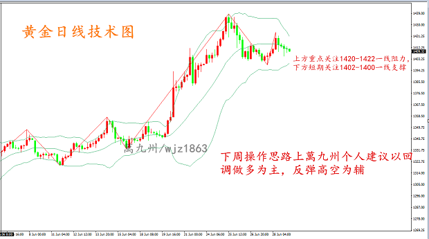 转眼一周快结束了,一切都好像照旧,又感觉崭新。黄金原油跌宕起伏的波动,每一天仿佛都在造就着不一样的神话。本周你的?操作如何?对于自己的收益是否还满意?无论是生活的悲喜,交易的盈亏我们应该学会总结。“温故而知新,可以为师矣。”一时的亏损不要紧,能够及时整理思路,总结问题所在,择其善者而从之,其不善者而改之。 黄金冲高回落,短期料维持调整测试千四大关; 周五黄金价格早盘冲高后日线小幅收跌,周五了结后金价收于1409一线;黄金价格6月结束后行情持稳1400整数大关;金价持稳因投资者在观望周末举行的至关重要的一轮贸易谈判,不过,由于市场预期美联储将放宽货币政策,取得2016年6月英国脱欧公投以来最大