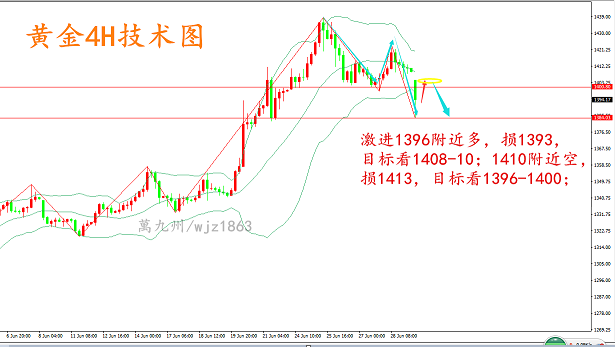如果你一直处于亏损,如果你还在迷茫,如果你还在市场上不断寻找老师,如果你还在为赚不到钱苦恼,那么你还在犹豫什么?前期亏损严重现资金量不大?新手投资者下单没有把握?心态不好害怕下单?没关系!无论你是新手还是老手,相信都需要一个改变现状的机会!以下内容个人观点,仅供参考,每日都会给关注的朋友推送我对当天行情的看法和操作思路,需要看建议的自行去看就可以了,行情瞬息万变,恕萬九州不能给予大家及时的提醒,可以找到萬九州给予实时操作策略。 黄金开盘重挫失守1400,短期继续看跌反弹继续空; 上周中黄金价格一直持稳于1400整数关口上方运行,不过本周一开盘后黄金价格短线重挫一度跌至1384一线,直接失守1