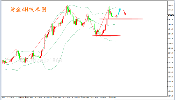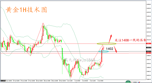 萬九州注黄金原油多年,金融领域,博大精深,每天行情波折不断,我所能做的就是用我的研究经验,给大家帮助。投资有风险,操作需谨慎! 7.3黄金后市走势点评:金价再破千四,后市黄金怎么看? 市场方面:昨日晚间由于美联储梅斯特:脱欧、贸易政策以及中东局势都是不确定性的来源,就业增速可能有放缓趋势,失业率低于可持续水平。包括对经济的讲话导致黄金继续短线走高。 昨日黄金晚间23点才开始上涨之行,截止到23:40黄金上行至1402的高点,这让看多的人,走的比较缓慢。目前的趋势有继续上冲的动能,似乎有回补缺口的迹象。午夜我们就关注1408一线的压制。那么一但千四站稳了,那么黄金将会继续上行去延续多头的走势。