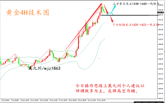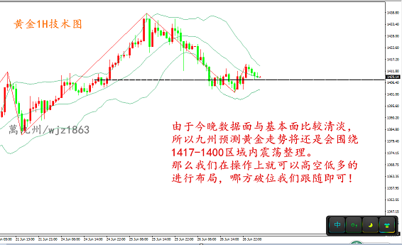 如果你一直处于亏损,如果你还在迷茫,如果你还在市场上不断寻找老师,如果你还在为赚不到钱苦恼,那么你还在犹豫什么?前期亏损严重现资金量不大?新手投资者下单没有把握?心态不好害怕下单?没关系!无论你是新手还是老手,相信都需要一个改变现状的机会!以下内容个人观点,仅供参考,每日朋友圈都会给关注的朋友推送我对当天行情的看法和操作思路,需要看建议的自行去看就可以了,行情瞬息万变,恕萬九州不能给予大家及时的提醒,可以找到萬九州给予实时操作策略。 黄金早间跳空高开,试探1411的高点后就震荡慢跌,回补缺口,对于上周的大涨大跌行情来而言,本周黄金开局就显得比较温柔了,不过日线周期收大阳强势上涨,在没有出现明
