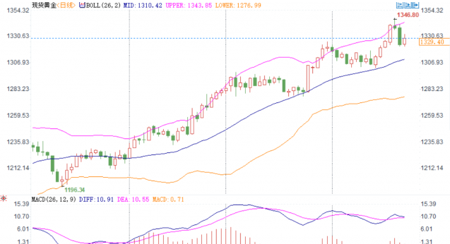 23日现货黄金周评,避险情绪助推黄金多头,1350仍是重要关口! 截止2月23日当周,现货黄金整体于1320-1350美元区间宽幅震荡,最高触及1346.80美元,刷新10个月高点,为5年内第5次试探1350美元关口。 因此前美联储会议不及预期鸽派持续发酵,多家机构认为美联储2019年若会实现加息,同时欧元区2月Markit制造业PMI初值连续14连降,对美元构成支撑,这使得黄金一度跌至1320美元关口附近 现货黄金现报1329.40美元/盎司,周涨幅0.65%。 日线级别来看,K线在布林带上轨承压,加上MACD顶背离后有结成死叉迹象,短线偏向下行,初步支撑在隔夜低点1320美元一线附近。此