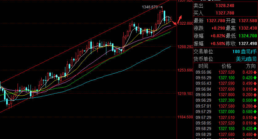 2.25日,黄金遇阻震荡,突破压力位或将继续看涨 人生总是在做选择,也总是在等待结果,道路不可能是一帆风顺,总会有坎坎坷坷,但平庸一定不是我们追求的目标。 上周回顾: 上周整体冲高回落; 黄金上周一早盘企稳1320美金强势上涨; 上周二周三黄金延续突破上涨,最高上涨触及1346美金,触及上涨通道上趋势线压力1346美金承压回调; 上周四延续深度回调,最低下跌1321美金; 上周五黄金晚间企稳1321美金震荡上涨,收盘1327美金,周线报收一根带长上影线实体小阳K线。 金价将进一步展开回落的空间,测试1300关口将会进一步的增加。 技术面: 黄金周K线收一根带长上影线阳线; 从K线整体来看,预