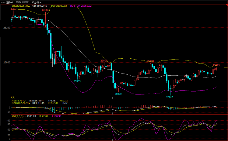 【恒指收盘】 8月22日消息,由于零售商塔吉特和劳氏业绩超预期,短暂消除了人们对经济衰退的部分担忧,美股攀升。因会议纪要未表明美联储准备大幅降息,美国股市收窄涨幅。今日开盘,港股恒指高开0.01%,午后一度跌超1%。截止收盘,恒生指数(26048.72, -221.32, -0.84%)跌0.84%,报26048.72点;国企指数跌0.53%,报10122.9点;红筹指数跌0.73%,报4194.95点。港股上午收跌229点。午后曾扩大跌幅至穿,26000关口,恒指低见25977,最多跌292点。随后跟随A股市场造好而收窄跌幅,再重上26000,并续在附近横行收盘。 进退博弈:恒指,德指