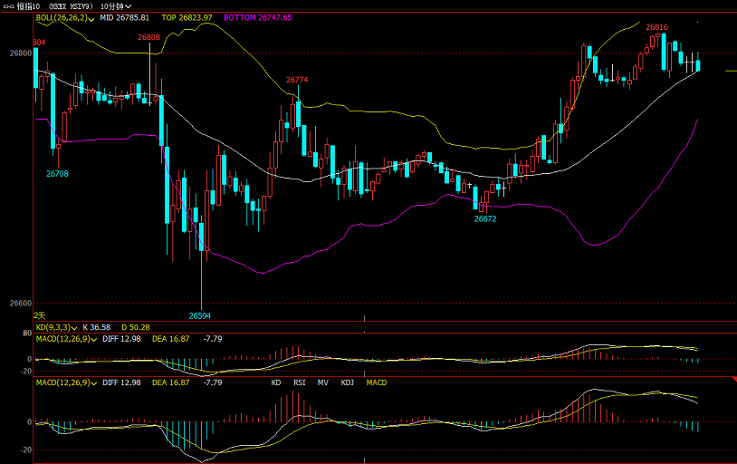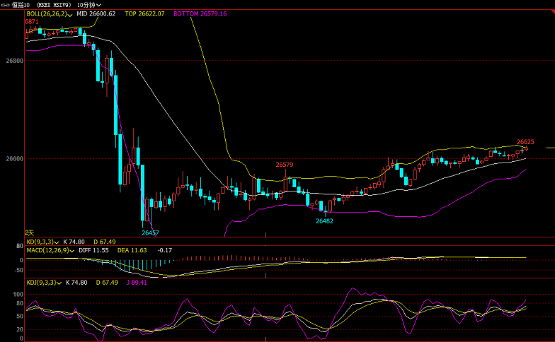 恒指10.25号资讯:周四(10月25日)美股三大指数收市涨跌不一。截至收盘,道指微跌0.1%报26805点,标普500涨0.19%报3010点,纳指涨0.81%报8185点。港股ADR指数全日反复向下,按比例计算,收报26727点,跌69点。大型蓝筹个别发展,汇丰控股收报61.86元,较港收市涨0.01元;腾讯控股收报316.57元,较港收市跌2.43元。 经历了过去几日震荡向下调整后,恒指昨日再度反弹至10月以来的高位附近。从盘面上看,恒指在10日均线处的体现了良好的韧性,短期可视为一个较强的支撑点。 另外值得注意的是,恒指再度回到5日均线上方,但从前一个交易日的表现来看,其可靠性并不高
