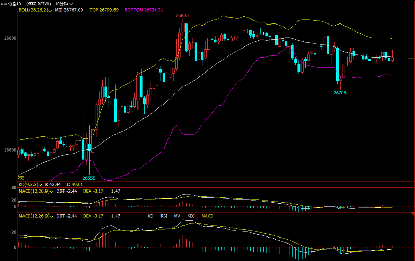 恒指10.24号早盘资讯:本周美企财报季持续进行,业绩主导下,周三(10月23日)美股三大指数收市小幅上扬。截至收盘,道指涨0.17%报26833点,标普500涨0.28%报3004点,纳指涨0.19%报8119点。美股靠稳,刺激港股ADR指数全日向好,按比例计算,收报26615点,涨48点。大型蓝筹涨跌互现,汇丰控股收报61.72元,较港收市涨0.52元;腾讯控股收报318.26元,较港收市跌1.74元。 经历多日相对高位的盘整后,在无明显的消息引导下,恒指昨日选择向下调整,弥补上周跳空的缺口。随着此役熊军告捷,多空双方又回到了此前的博弈点位。从盘面看,恒指下方仍有较好的支撑力量,但受制于