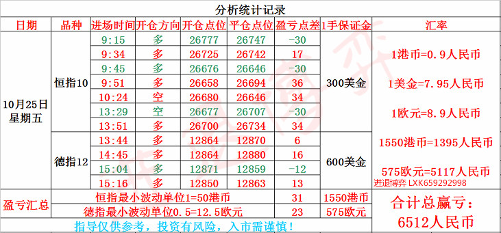 【恒指收盘】10月25日消息,美股周四收盘涨跌不一,苹果市值首次突破11000亿美元。投资者继续关注密集出炉的美企财报。即将离任的欧洲央行行长德拉吉强调宽松政策与经济下行风险。今日开盘,恒指低开0.01%,盘中跌幅一度扩大至6%。截止收盘,恒生指数(26667.39, -130.56,-0.49%)跌0.49%,报26667.39点,国企指数跌0.63%,红筹指数涨0.45%。 进退博弈:恒指,德指10.25号交易总结 ①今日恒指整体走势: 上午先跌后涨,再走区间震荡,尾盘上破后高位横盘震荡。下午先涨后跌,破位下行后再走区间震荡至结束。 ②群内指导: 早盘看好上午先涨后跌,再走单边震荡反弹,