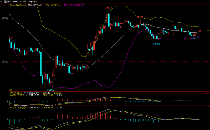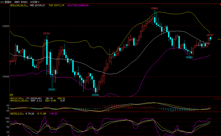 【恒指收盘】 8月27日消息,美股周一收高。国际贸易关系有所进展的消息提振了市场情绪。市场仍在关注本周美国GDP等数据,以进一步研判美国经济衰退的可能性。今日早盘,恒指高开高走,午后转跌。截至收盘,港股恒指跌0.19%,报25615.48点;国企指数跌0.15%,报9980.73点;红筹指数涨0.78%,报4158.78点。 【恒指交易】恒指,德指8.28盘中交易图 ①行情回顾: 恒指周三早盘高开低走后快速打低25730一线,开始急速反转走反弹,冲高均线承压位25760一线站稳后上破走反弹,一路快速冲高至25830一线。上证开盘行情两轮上破承压,收线黄昏之星高位收阴线开始震荡下行走一轮跌势,