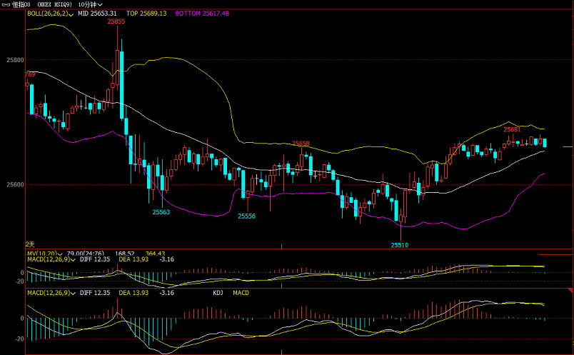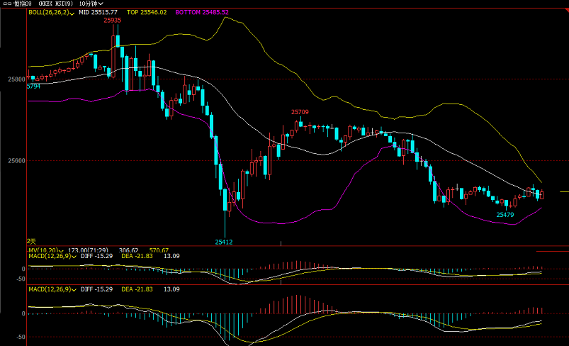 【恒指收盘】 ①行情回顾: 恒指周一早盘大幅低开后直接打高一轮,后续行情承压开始跳水大跌,两轮下探刷新低于25190一线。横盘震荡一段时间后开始企稳反弹,冲高25310一线后行情承压再次走区间震荡回落,维持梯形震荡下行较长时间。刷新低25150一线后受强支撑开始企稳反弹,强势震荡上行反弹300个点,至25450一线均线附近再次承压小幅回落部分后走震荡,尾盘维持高位横盘结束。下午开盘恒指先走一轮回踩跌势,后续较长时间维持窄幅区间震荡,上证收盘最后阶段强势反弹冲高,反抽幅度近300个点,区间加剧震荡,上证收盘后欧股阶段维持高位区间震荡至结束。整体走势:上午先跌后涨走大区间过山车行情,尾盘高位震荡