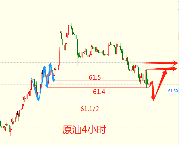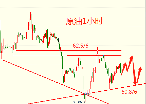 富人思维:用别人的能力为自己致富;穷人思维:只想着靠自己的蛮力致富。现在有一个机会摆在你面前,你可以选择继续观望,但你的生活依然不会有任何改变。一念非凡还是一念人间,选择在你。 5.6周一原油 分析及建议: 技术面分析:今日亚欧盘冲高触顶回落,最高触及62.5停止了脚步,目前大的趋势是空头, 原油处于震荡回落,现价61.4一线昨日第二波上涨修整蓄力的点位,这个点位突破还是很容易的,重点关注的是下方61.1/2一线的转折点;美盘技术面,日K线在60日位置获得支撑后强势上扬,收一根带下影线实体阳线。1小时图40和60日均线金叉向上,从位置来看,61.1/2区域是昨日价格上涨回调的25%位置,属于