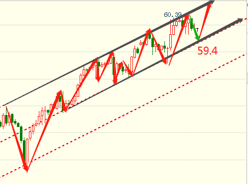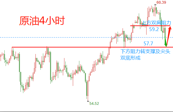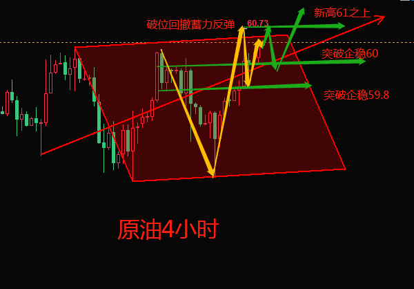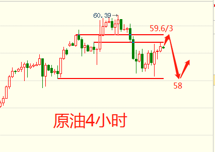 交易暗藏风险,有时候等你看明白了,一切也都成历史了;金融领域,要想获得利润,就必须得走在别前面。别人埋怨时,你反思;别人懊悔时,你总结,别人犹豫该不该进时,你果断出击。等待永远只会让你错过,再想追时,却掉进追涨杀跌的陷阱,这就是行情。 4.1周一原油分析及建议: 上周原油上演深V触底反弹创新高60.7一线,而上周五创高得力于蓄力破位,企稳在关键的点位,第一处:59.8,第二处:60关口破位。 今日亚盘开盘走延续上涨,日线上两阳夹阴的形态,而趋势上看好上涨,主要的承压点位怎么选择,短线4小时上看一直盘整在高位,俗话说:高处不胜寒,要想不担心受怕主要看站住的脚硬不硬,这也是短中线一种趋势,经过上