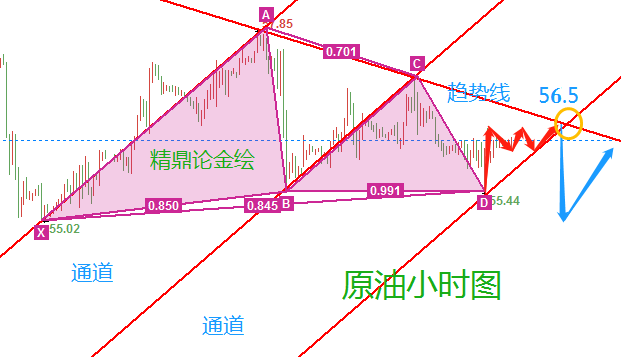 交易暗藏风险,有时候等你看明白了,一切也都成历史了;山不过来,我过去;在这里,最大的价值是时间,最大的风险是拖延!方向反了,停止就是进步,转身就是盈利。在市场很多人喜欢大行情波动,把握住行情就有机会赚到钱。我的价值就是能够给人投资者提供帮助,而不是模糊过日子,这样才觉得生命没有白白浪费。 3.5周二原油 分析及建议: 原油昨日震荡上行遇阻回落原点触底反弹,最高57一线,最低55.8,整体波动不大,昨日也是建议57/56.8一线空单,触及下方55.9一线反弹,把握利润不大。后续继续努力。 原油周线上看承压58中轨阻力压制待突破,日线上看受中轨55一线支撑,整体来看上轨受压中轨支撑仍然是上涨势头