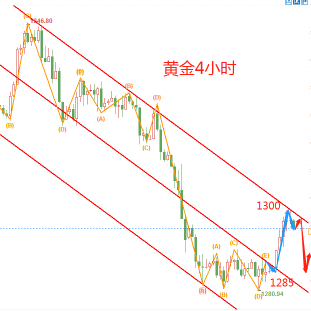 金融领域,要想获得利润,就必须得走在别前面。别人埋怨时,你反思;别人懊悔时,你总结,别人犹豫该不该进时,你果断出击。等待永远只会让你错过,再想追时,却掉进追涨杀跌的陷阱。这就是行情。 黄金3.6周三黄金行情分析及操作建议: 黄金昨日上涨乏力回落创新低点1281一线,最高触及1289,昨日建议也是1289/92一线空单,目标1284,1283/85一线多单目标1295没有到达,但整体利润也是小有收获。 黄金周线上看布林带看上轨与中轨之间震荡,似乎上方1347一线已经见顶。日线上深V见顶回落,布林带大幅回调突破下轨支撑全无回调之意,那么事实是不是如此,短线四小时亚盘开盘承压1290震荡下行128