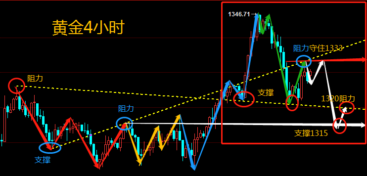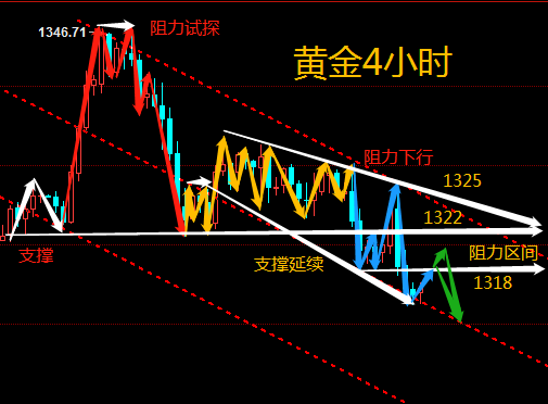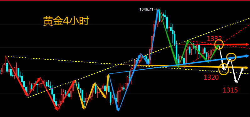 金融领域,要想获得利润,就必须得走在别前面。别人埋怨时,你反思;别人懊悔时,你总结,别人犹豫该不该进时,你果断出击。等待永远只会让你错过,再想追时,却掉进追涨杀跌的陷阱。这就是行情。 黄金2.25周一黄金行情分析及操作建议: 黄金上周多头强势回归最高触及1346.7一线回落1321一线受到支撑上周,黄金上周也是波澜起伏,每天波动在15个点左右游走,目前处于上方阻力1333,下方支撑1321. 日线上看上周黄金在布林带上轨穿刺无力下行,现处于上轨与中轨之间,亚盘开盘先跌后涨,最低1326,目前正在上涨之中。短线4小时黄金受布林带中轨阻力1333一线,且1333这一线也是上周五的阻力位置,kdj