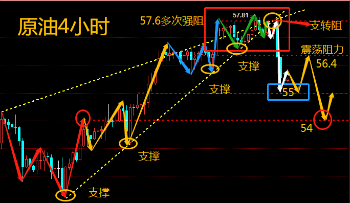 交易暗藏风险,有时候等你看明白了,一切也都成历史了;山不过来,我过去;在这里,最大的价值是时间,最大的风险是拖延!方向反了,停止就是进步,转身就是盈利。在市场很多人喜欢大行情波动,把握住行情就有机会赚到钱。我的价值就是能够给人投资者提供帮助,而不是模糊过日子,这样才觉得生命没有白白浪费。 3.4周一原油 分析及建议: 原油上周五再次承压58下方短线下挫2.3美金触底反弹,最高57.84,最低55.57,触底冲刺56无力收盘56下方,上周从容把握精准把握合理点位57.9/6空,目标55.8,下方55.5/8多,目标56.8整体把握2美金利润。 原油周线上看承压58中轨阻力压制待突破,日线上看受