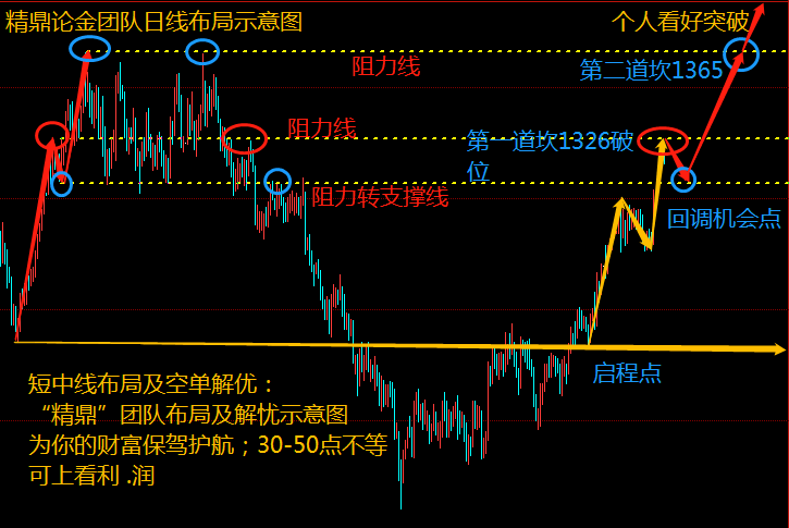 交易暗藏风险,有时候等你看明白了,一切也都成历史了;山不过来,我过去;在这里,最大的价值是时间,最大的风险是拖延!方向反了,停止就是进步,转身就是盈利。在市场很多人喜欢大行情波动,把握住行情就有机会赚到钱。我的价值就是能够给人提供帮助,而不是模糊过日子,这样才觉得生命没有白白浪费。 黄金多头本周借得上周五“东风”,进一步走出突破行情,价格周四刷至去年5月11日来高点位置1326一线,周五时段因中美贸易关系乐观推进,避险有所降温,即便非农报告中欠佳的薪资增幅和失业率数据也未能推升价格升破1326水平。 正如笔者所说黄金1326一线未能企稳,必定会回调: http://www.yocajr.co