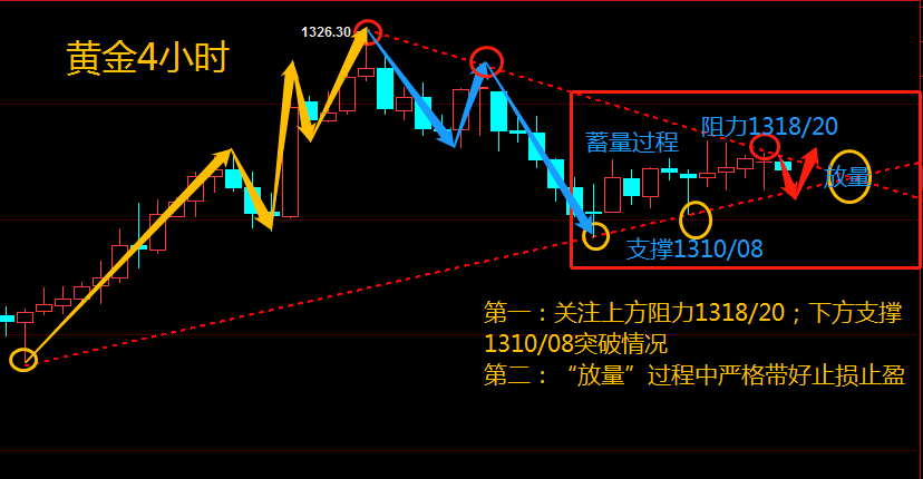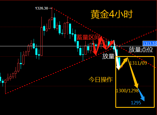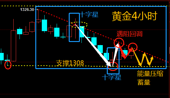 金融领域,要想获得利润,就必须得走在别前面。别人埋怨时,你反思;别人懊悔时,你总结,别人犹豫该不该进时,你果断出击。等待永远只会让你错过,再想追时,却掉进追涨杀跌的陷阱。这就是行情。 日线黄金周三上冲乏力回落创新低,亚欧盘发力上涨,未能有效突破本周回落之势,最高触及1316下方回落,美盘开盘上涨也未能改变回调需求,短线图:4小时来看本周黄金区间压缩蓄量,定点在1313.8一线放量下破1306一线,昨日也提到周三继续关注下方1308/10低点,此点位支撑不失守暂时看不到下行空间,但昨日蓄量已完成,且下破支撑,定点1306一线,整体来看今日可关注昨日支撑位转换为阻力线,依托1311/1309点位