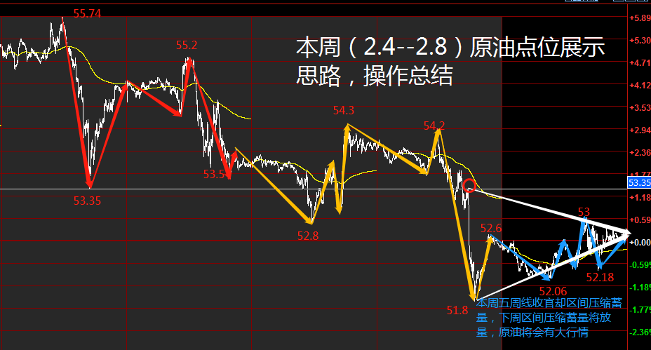 交易暗藏风险,有时候等你看明白了,一切也都成历史了;山不过来,我过去;在这里,最大的价值是时间,最大的风险是拖延!方向反了,停止就是进步,转身就是盈利。在市场很多人喜欢大行情波动,把握住行情就有机会赚到钱。我的价值就是能够给人提供帮助,而不是模糊过日子,这样才觉得生命没有白白浪费。 周二2.12原油思路及操作建议: 昨日原油触顶回落创新低双底程反弹,最高触及52.8,最低破位上周低点51.8到51.3反弹上行52.5一线修整,昨日也是提到 52.8/53.1 会有一波放量暴跌51下方,只是未能到达止盈点位而已,对此再次试探下方支撑强弱,也是为今日操作奠基了基础。 短线图:四小时图目前处于布林