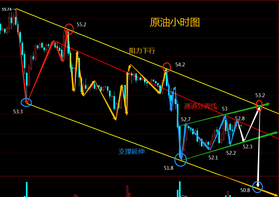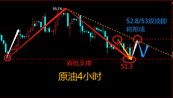 交易暗藏风险,有时候等你看明白了,一切也都成历史了;山不过来,我过去;在这里,最大的价值是时间,最大的风险是拖延!方向反了,停止就是进步,转身就是盈利。在市场很多人喜欢大行情波动,把握住行情就有机会赚到钱。我的价值就是能够给人投资者提供帮助,而不是模糊过日子,这样才觉得生命没有白白浪费。 原油EIA数据即将开始,目前我们先回看昨日行情及今日亚欧盘走势,昨日沙特公布减产数据及欧佩克月报的数值打了空头趋势一个措手不及,一路上涨54整数关口,而消息面的冲刺必将会有所回调,昨日也是小有回撤52.9一线,最终收盘53.1一线。 今日亚欧盘走势一直在开盘点位53.3上方及压力位54下方区间拉锯,最高触及