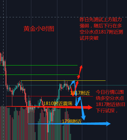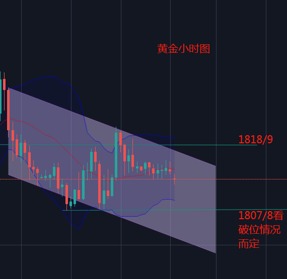 黄金昨日最高1824附近,最低1807附近空间跨度不大,处于中轨线上下拉锯,让前期处于下行趋势得以回升收缩防御,下跌空间进行修正,根据大趋势回落有所减弱,短期趋势又处于试探阶段,而MA10与MA20形成趋势方向,需要时间蓄力试探。 小时暂时还处于轨道中震荡修正运行,此前的弱势下跌,目前处于修整蓄力,局部看目前进入震荡周期。布林道开始收口,在震荡中蓄势;昨日未放量,今日仍有可能继续震荡修正过程,技术上指标进入收缩震荡,日内短线暂时关注小时布林道上下轨之间的高抛低吸。大方向看空趋势未改,对依旧延续昨日点位。 个人建议:1818/9附近空;防守1824附近;看1807/8破位,延续1798附近 原