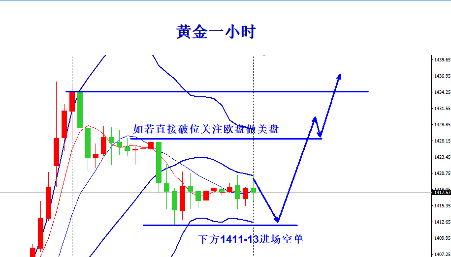 昨天美盘间黄金突破1400后,短期看法就发生改变,不能对空单抱有任何幻想,所有空单均要离场走人,并且早间开盘只要收盘于1400上方,早间开盘势必直接做多不犹豫。在前日行情强势收盘的情况下,早间势必会有大量追多入场,行情也肯定会直线拉升,速度很快,所以早间开盘只要是前日强势收盘,直接开盘进多无需多想。 这个战法我们经常使用,只要前日强势收盘那么早间我们便直接去做多单,防守放在凌晨回撤低点即可,凌晨回撤低点是前一日行情走出来的一个支撑,也是比较有效。因为强势行情能走回调,那么说明这是空头最近所能释放的最大能量,所以以此为防守还是比较安全。所以早间开盘1418.5直接做多,止损放在1416,此点也