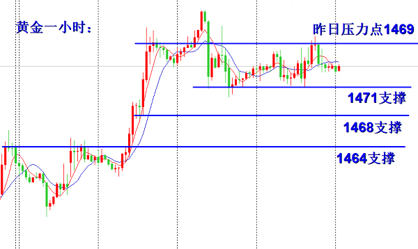 黄金今日的走势与周一周二如出一辙,完全复制周一、周二的走势,开盘之后早间小幅下跌,下跌之后连续上涨。目前即将进入美盘阶段,今日能否和周一、周二一样,在美盘形成反转,我们需要进一步观察,最近的行情我们可以发现,下方的低点在不断的抬高,而上方的高点在不断的破位,所以今天我们还是比较看好破位昨日高点1469一线,所以目前我们建议观望即可。如果手中有早上给到的1462的多单多单在1466.5减仓之后可以继续持有,无需全部平仓。 目前我们比较看好的上部压力位置,1472是之前多次下探的一个低点位置,那么在上升行情中也就作为一个压力位置所以,美盘我们还是比较看好,以此为压力进场空单,在其他点位不打算进场