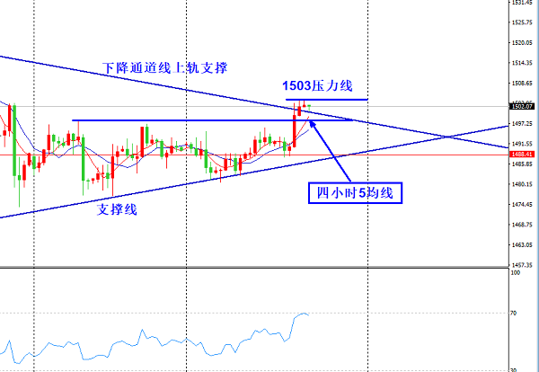 黄金目前从4小时走势来看,已经破位了下降通道线的上轨,昨天下降通道线上轨的压力在1501一线,昨天美盘时段直接向上突破了上轨压力,受压于前高点一线1503一线,目前震荡于1501附近。突破之后下降通道线的上轨将作为一个支撑,也就是我们常讲的顶底转换,此支撑在1501。强势的延续,1501的支撑起到一个关键作用。黄金在下降通道线之中形成了一个震荡三角形区域,此震荡三角形自10月1号开始成立至今已经有快一个月的时间,我们常讲“横有多长,竖有多高”,震荡时间越久也就意味着筑底的越牢靠,上涨的的动能也就越足,所以在此走势下我们暂且不考虑做任何空单,而是以逢低做多为主。 黄金昨日早间给出的操作建议就是