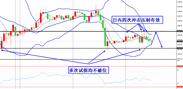 黄金昨日行情走得相对比较震荡,全天亚欧美盘前没有多大的行情操作性不强,在凌晨时段出现了一波强势拉升,但是受阻于1497~99一线,并没有突破前高点1503。晚间收盘又走了一个较为深度的回调,收线于1491附近。从昨日的冲高走势,以及收线来看,黄金目前并不是很强势。下面我们详细的分析一下黄金日内该如何操作。 黄金目前仍旧是处于下降通道线之中,从9月初开始运行于此通道线之中,目前仍在此下降通道线之中,黄金要想有一个大的行情,必须突破此通道线,否则将会一直以一涨一跌,慢涨慢跌式的行情震荡向下运行,今日上方反弹的压力主要为,1498前高点以及昨日反弹高点压力,和下降通道线上轨压力线,在1507处,今