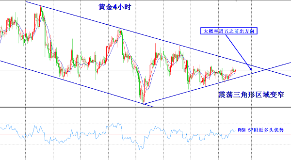 黄金目前整体还依旧处于下降通道线之中,而下降通道线之中形成的斜支撑也是和下降通道线上轨,构成了一个震荡三角形走势。虽然每天大行情分析都是这样,但是每天还得这样一一的分析。目前我们可以看到自10月1日触碰到下降通道线下轨1460之后,向上反弹确认了1520一线压力之后,然后开启了一波下跌,但是下跌并没有再次回踩下降通道线下轨,而是在通道线内形成了一个斜支撑,在此震荡三角形内运行,目前区间越来越窄,即将面临着突破。从盘面来看,预计本周将会迎来突破,最迟不过下周二,所以也就是今天或者明天就有希望迎来突破,所以操作之中我们需要谨慎,而下方我们看4小时级别RSI目前也是处于57附近,展现出了多头略占优