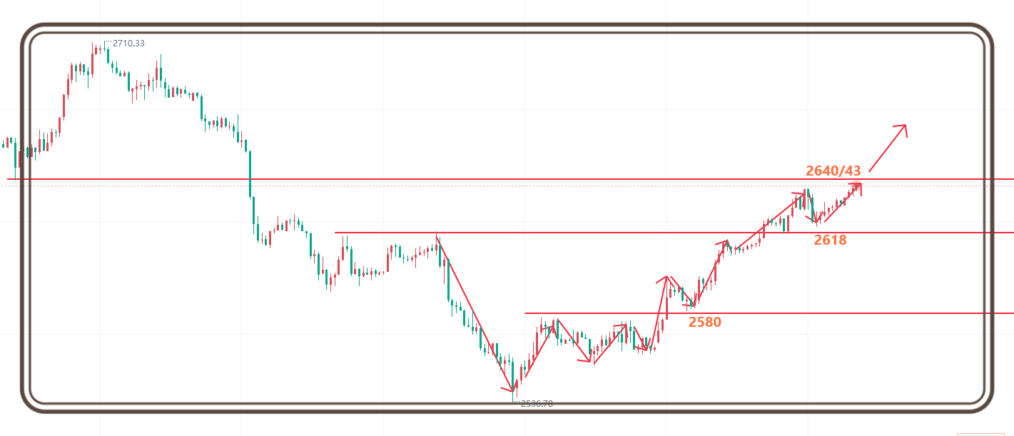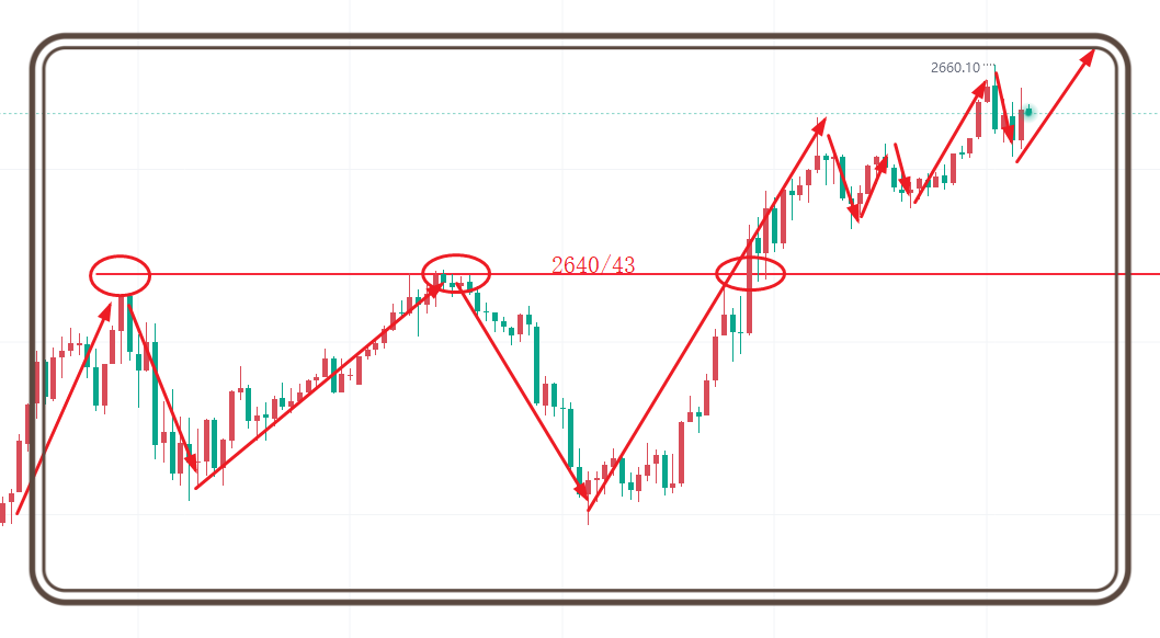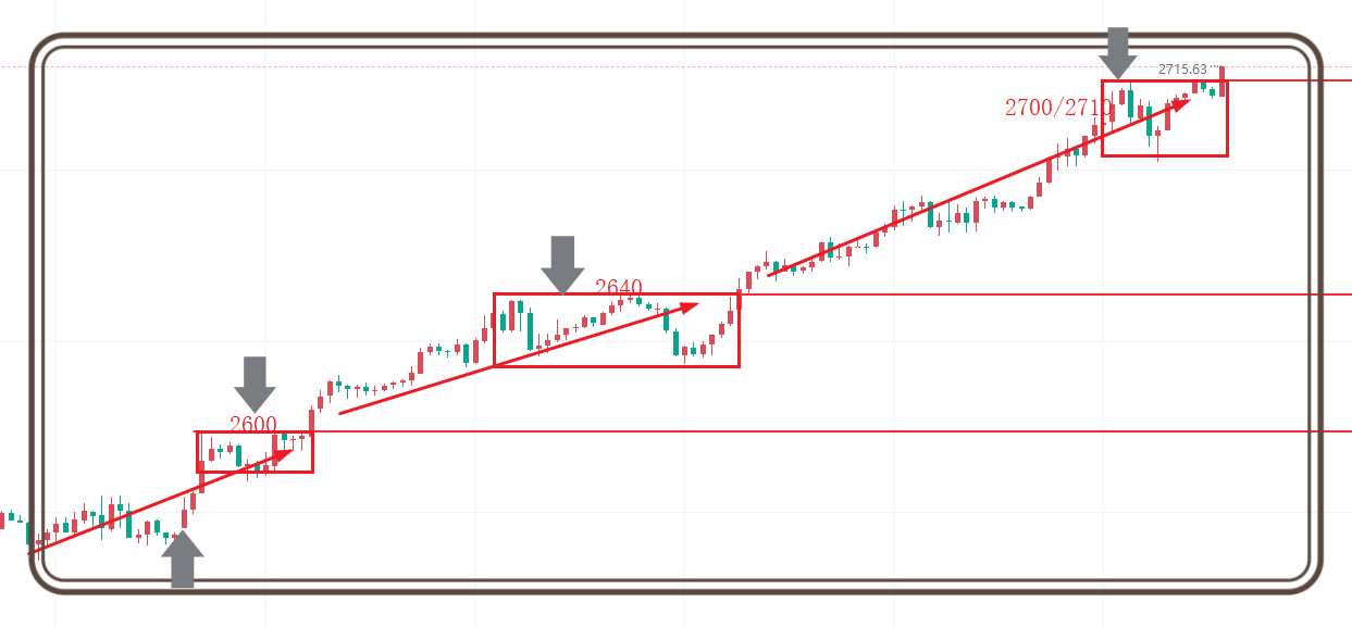 在刚刚过去的一周,创下本年度最佳单周表现。黄金价格从 2560 美元一路强势拉升,尾盘成功收高在 2715 美元位置。日线呈现出五连阳形态,周线长阳饱和阳线更是一举吞没前期的阴线下跌,多头来势汹汹,反弹势头已经收复了此前下跌的大部分失地。 回顾这一轮黄金的反弹历程,可谓是过关斩将。 其间较为明显的三个阻力位分别是 2600 美元关口、2640 美元关口以及 2700 美元关口。2600 美元关口作为本轮反弹首次遭遇较大阻力的关键点位,也曾导致第一次较大幅度的回撤,价格一度回撤到 2580 位置。不过,在该位置企稳之后,多头继续发力冲击 2600 位置,并成功突破,随后一路高歌猛进,直抵 26