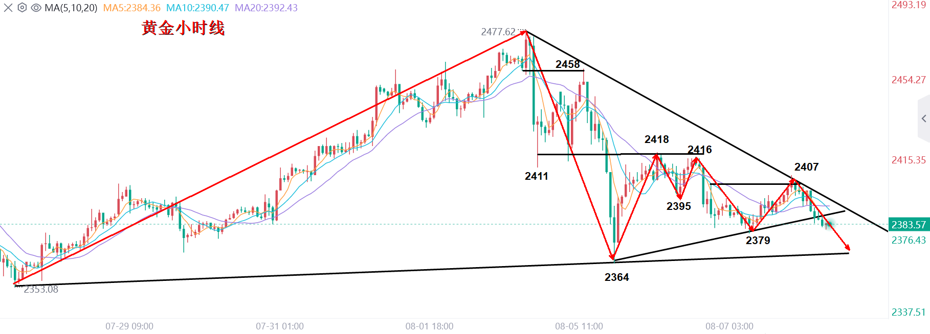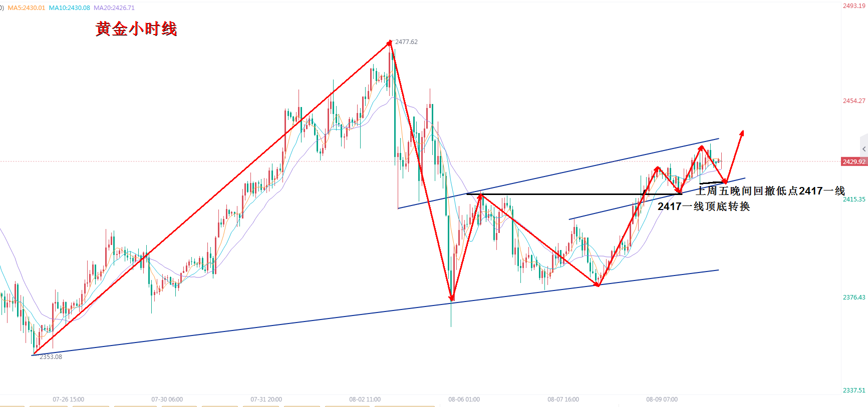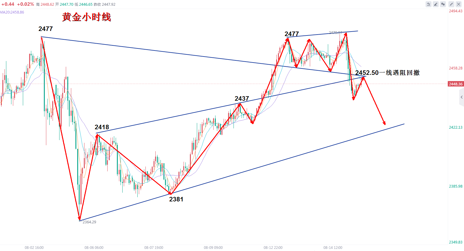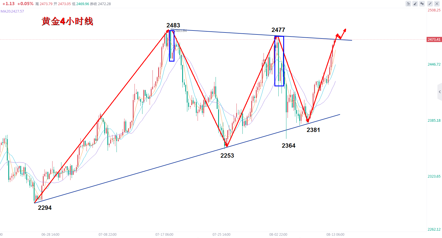 隔夜美国数据利多黄金反而走低,金价在劳工部公布7月未季调CPI年率等一些数据之前,金价以强势修正的形态运行,即便回撤空间也很小,美盘前金价最高上行测试2480附近,从技术形态方面来说很明显的多头优势,但是美盘小时线不断连阴下跌,最低测试2438一线,下破了前期回撤的低点2458.50一线,那么今日黄金是延续多头还是继续回调? 我们从昨晚美盘公布的经济数据以及形态方面找出端倪并做进一步规划: 首先,隔夜公布的数据来看:美国7月未季调CPI年率 2.9%,预期3.00%,前值3.00%。美国7月季调后CPI月率 0.2%,预期0.20%,前值-0.10%。美国7月季调后核心CPI月率 0.2%,