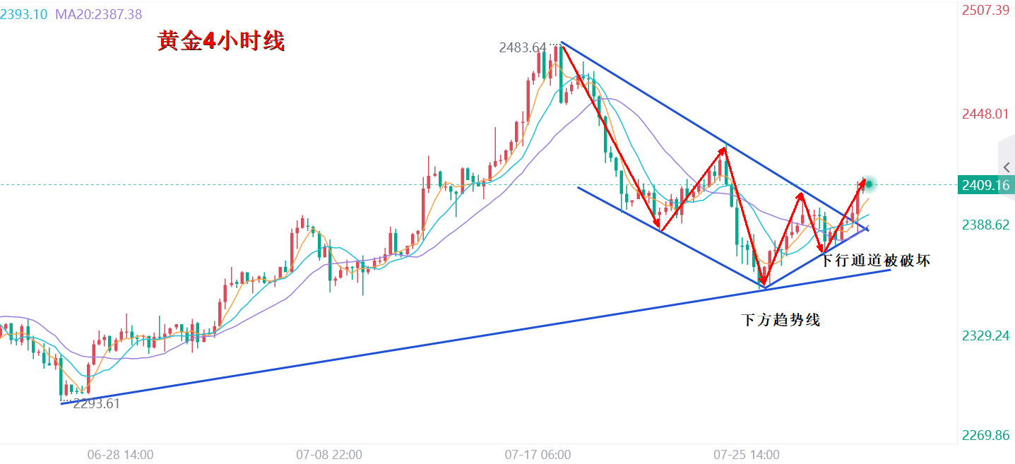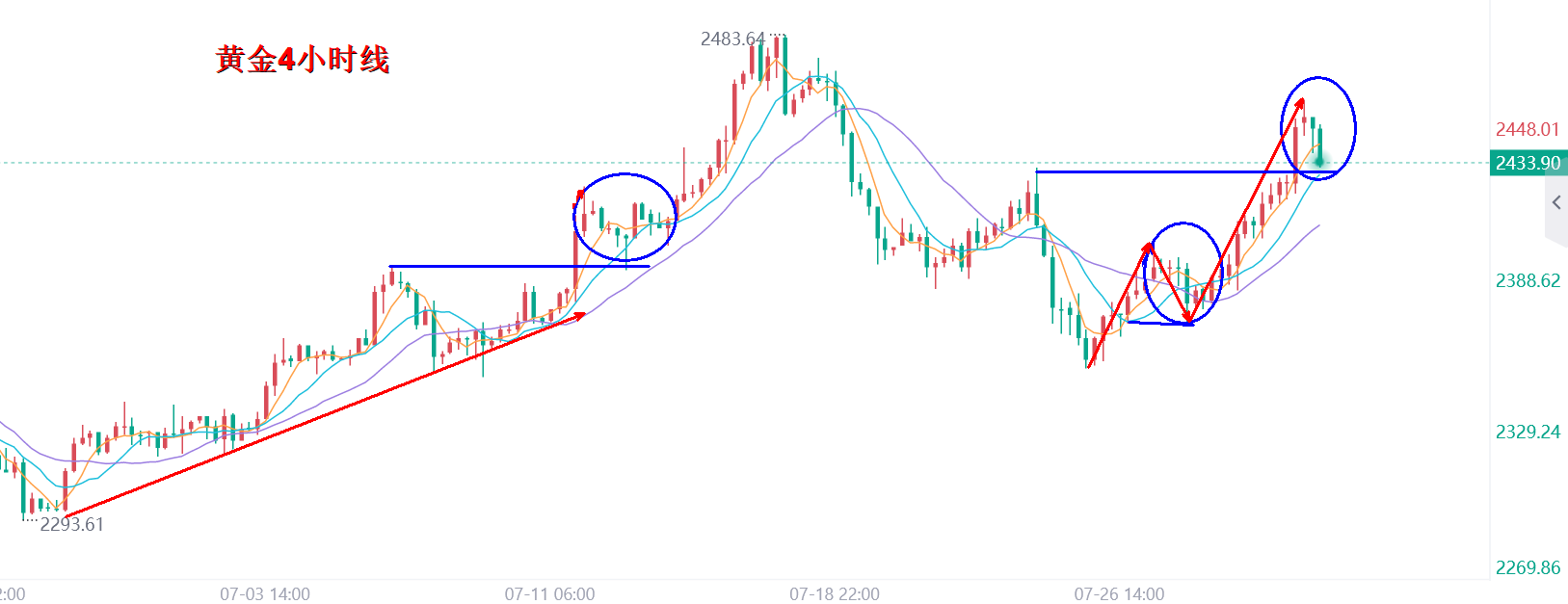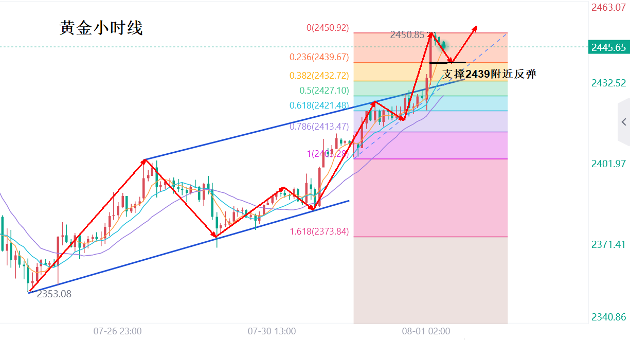 金价继续在凌晨发力走高,最高测试2450.80一线,突破前期下跌反抽的高点2432,多头的动能延续了昨日日内的强势格局。另外,昨日收月线,收盘在前两个月上方影线高点附近,而且7月K线实体饱满,给7月画上一笔完满的收官。对今日来说趋势明朗,顺势逢低多继续看涨。 接下来我们从多个方面解剖当前的走势以及日内的安排: 首先,哈马斯领导人伊斯梅尔·哈尼亚在伊朗首都德黑兰遭袭身亡。这是昨天的时间,但是影响在后面,因为伊斯梅尔·哈尼亚是在伊朗被遇刺,后面多方势力的反应都较为强烈:伊朗领导人下令对以色列发动袭击,以就哈马斯领导人哈尼亚遇害进行报复。哈马斯下属武装派别“卡桑旅”:将遏制以色列,让其为自己的