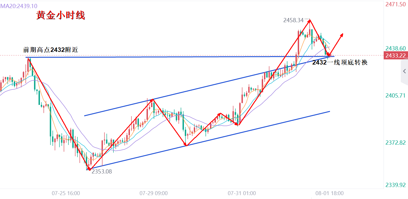 黄金昨日早间冲高回落,支撑在前期高点2432附近后欧盘小时线转阳拉升,最高测试2462.20一线,美盘没有延续走高反而又走了冲高回落,以区间修正的格局运行,凌晨小幅波动,那么在非农前黄金走势该如何对待? 接下来我们从地缘,经济参数以及技术形态方面看下: 首先,当地时间8月1日,以色列军队电台称,据知情人士透露,由于巴勒斯坦伊斯兰抵抗运动(哈马斯)政治局领导人伊斯梅尔·哈尼亚遇袭身亡,哈马斯无限期冻结了停火和人员交换协议谈判。这对中东来说是一件非常严峻而且严重的军事冲突,而且对目前战事心态来说是火上浇油,增加冲突的概率增大了很多,进一步的战事一触即发。所以黄金的避险还将继续推动。 其次