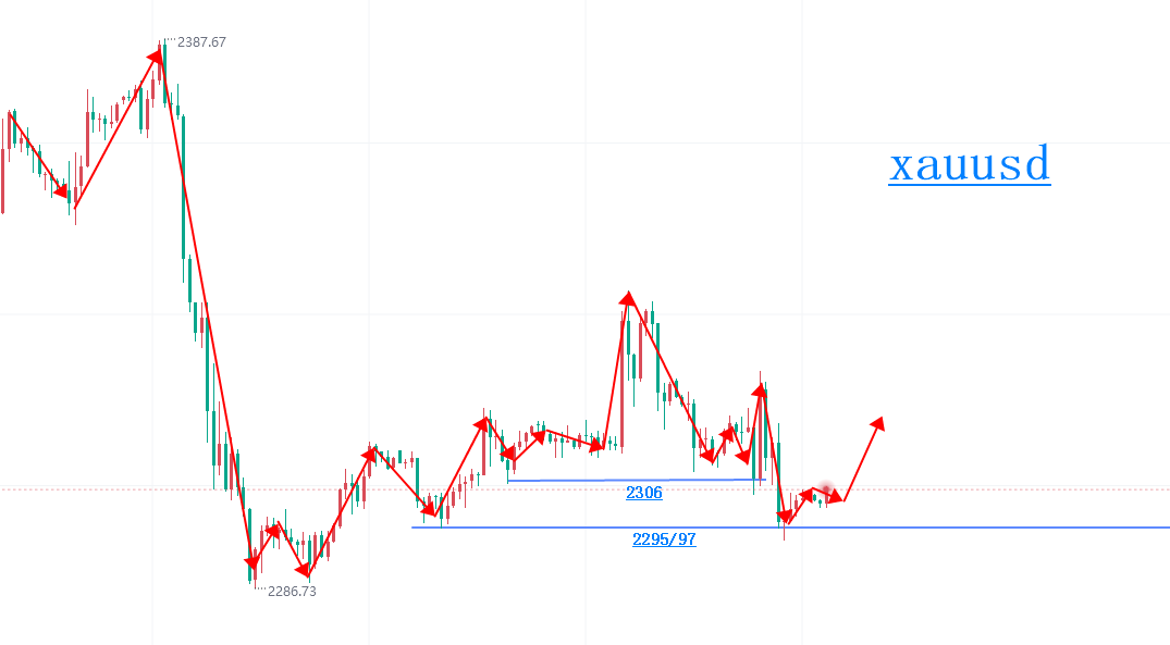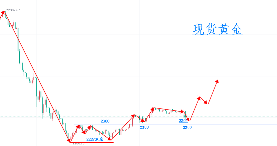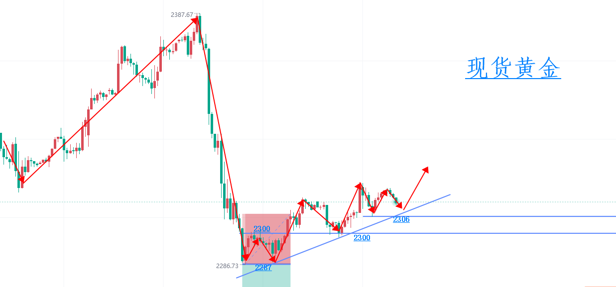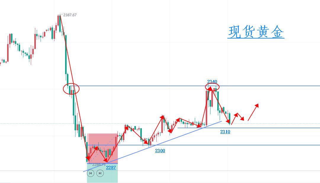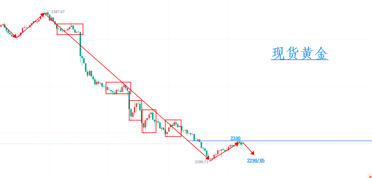 现货黄金目前报价在2307美元一线。早间盘面我们给出围绕2300美元直接放空的布局安排,下看2290,2285位置,盘面价格也是回踩到2287美元,短线空单拿到一定利润空间。 这个空单的布局,主要基于行情为空头的思路来看待,若是走空的行情,在周五连续走弱,再加上夜间盘面继续创低之后,那么本周开盘亚盘势必有反弹修正出现,而反弹修正的高点就是压制位,围绕这一位置继续放空即可,同时这一位置刚好处于2300美元的整数关口,整数关口的跌穿,支撑变压制,那么按照空头来看待当前的行情的话,这里必然是最佳的放空点。 空单的入场,盘面价格的回落,视乎一切都在按照空头节奏再走,但在盘面价格触及2287美元后,没