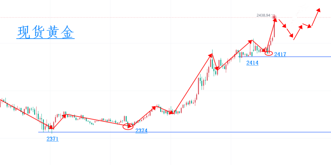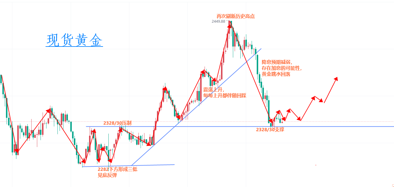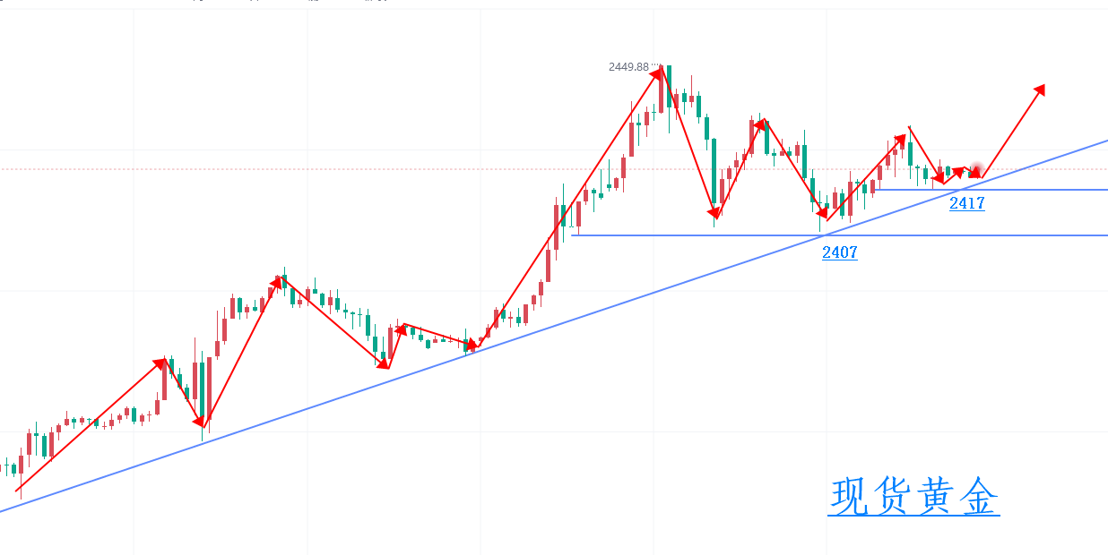 早间盘面我们直接给出现价2426的开多布局安排,而早盘冲高不过2433位置,未能直接走强,反而是回落打掉我们的止损,然回落并不影响我们继续看多的节奏,回踩仍是多,进而我们在2415以及2410继续开多入场,目前已经给到2423位置。 我们一直强调2407是多头的底线,只要2407不被跌穿,继续开仓拿多即可! 因美元和美国国债收益率反弹,金价从周一创下的2450美元/盎司的历史高位继续回落。市场注意力再次转向美联储政策制定者即将发表的讲话,由于美国没有重大经济事件,这些讲话在本周早些时候占据主导地位。 本交易日,美联储高官将密集发表讲话,包括美联储“大鹰派”沃勒以及美联储“三号人物”威