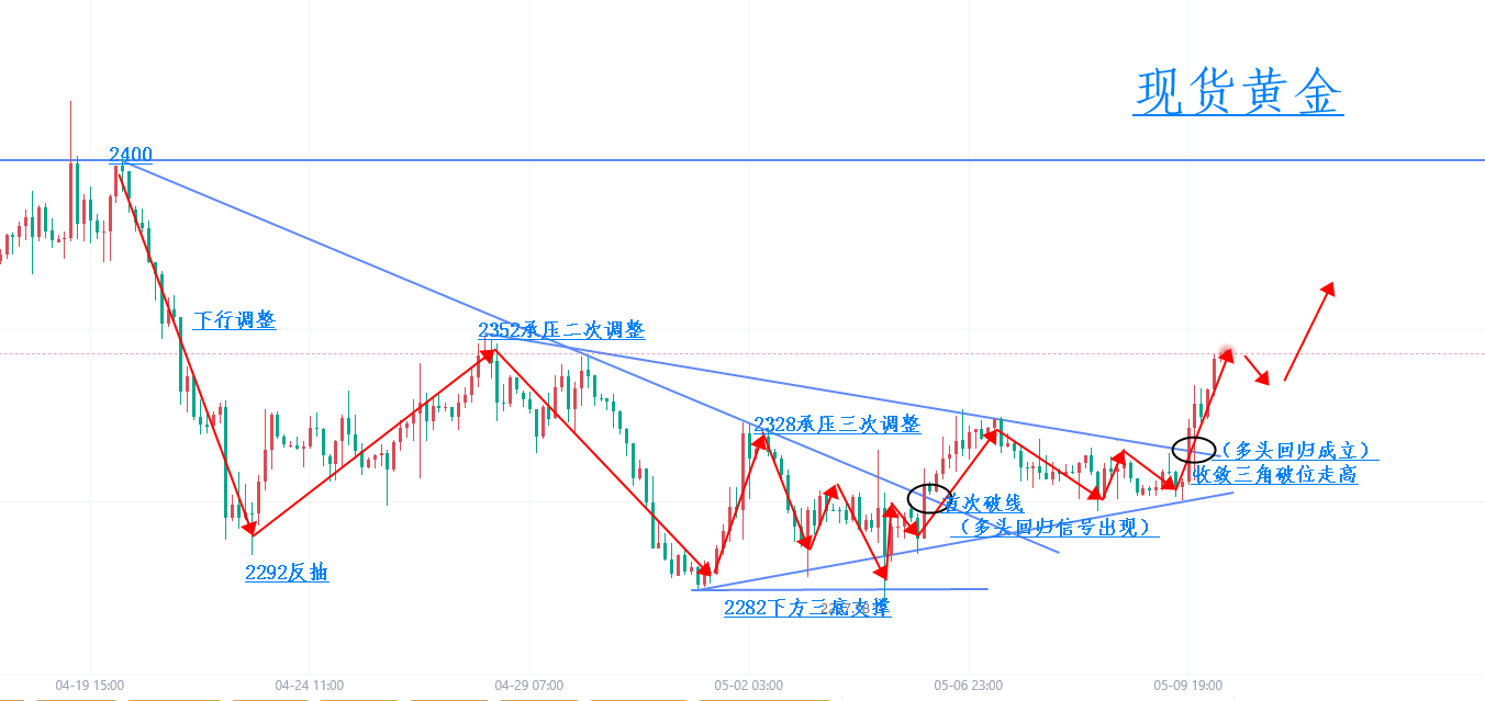 周四,因上周美国初请失业金人数增幅超过预期,从而加强了市场对美联储将在今年晚些时候降息的押注,美元指数盘中回吐日内全部涨幅并转跌,再加上加沙挺火谈判破裂,现货黄金则大涨超过1%,并接连突破2320、234、2342关键压制点,最终收涨1.61%,报2345.85美元/盎司,日线大阳收线。 美国至5月4日当周初请失业金人数录得23.1万人,为2023年8月以来新高。旧金山联储主席戴利表示,限制性利率发挥作用还需要更多时间,若劳动力市场恶化或可考虑降息。 哈马斯方面表示,本轮加沙停火谈判结束,哈马斯与以色列代表团均已离开开罗,一名以色列官员9日说,加沙地带停火谈判破裂,以军将继续在加沙地