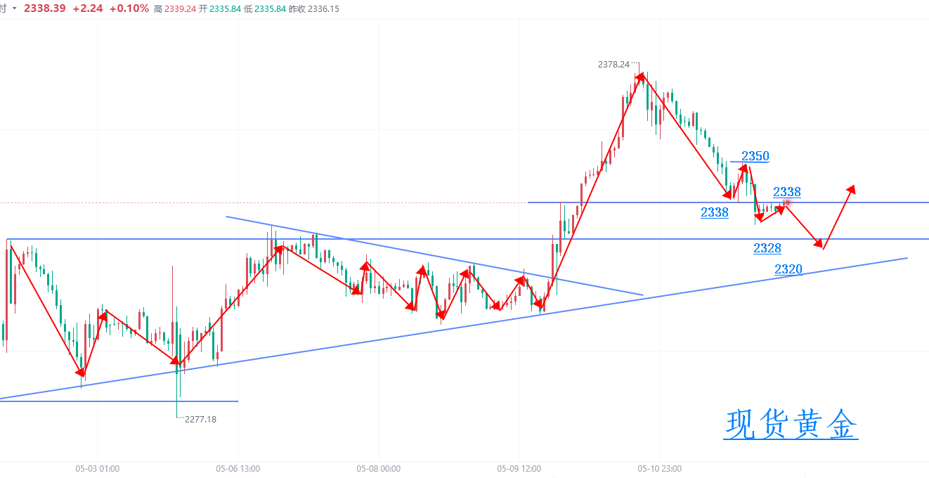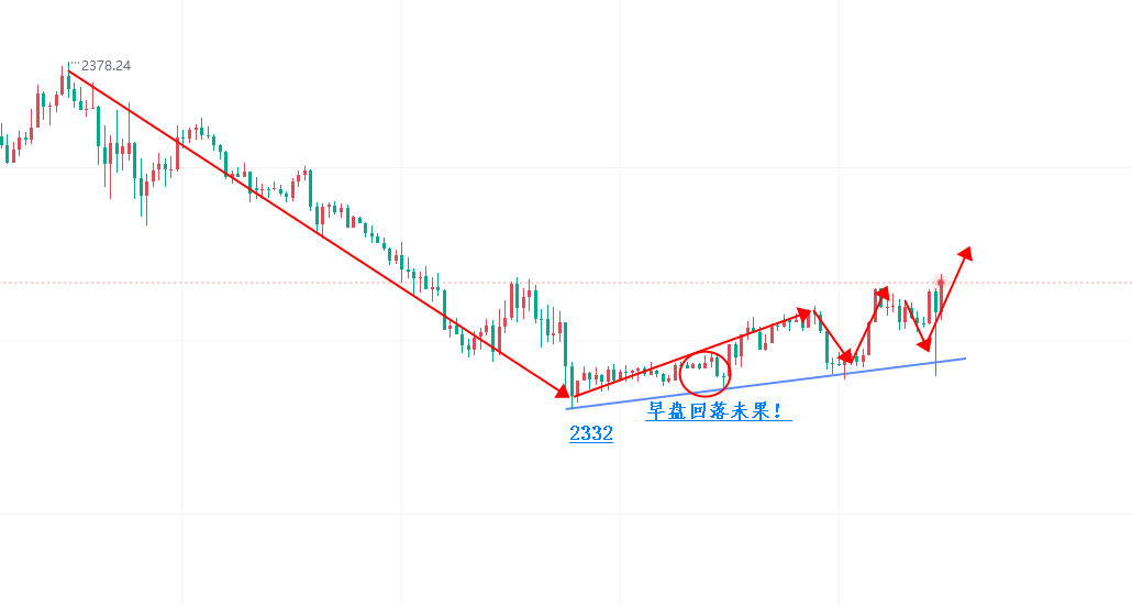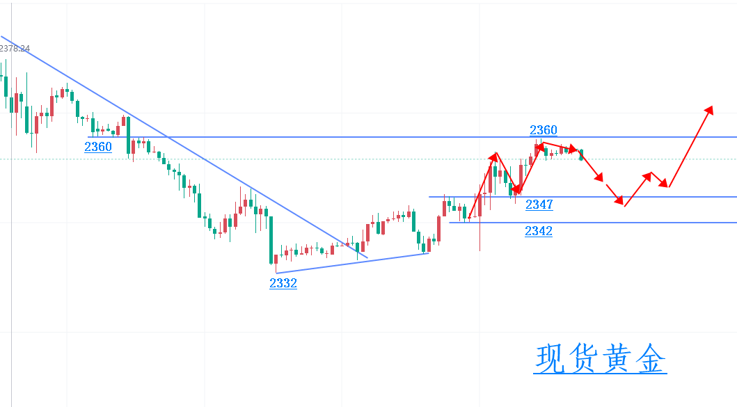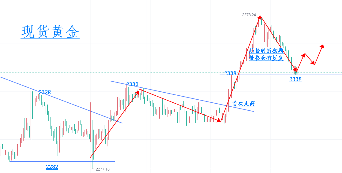 上周尾盘冲高2378美元上方后承压下行,测试2360下方后虽然企稳,但并未能反弹走高,意味着这个回撤没走完本交易日还有向下的空间。早间盘面我们也是规避了多单的操作,主要等亚盘回踩后做跟进,支撑上面我们给了2356,2347两个参考支撑位置,显然我们低估了回踩的幅度,盘面价格直接下滑到2340美元下方。虽然回撤是我们意料之中的,但回踩幅度意料之外。 对于接下来的操作,重点注意2338一线的支撑位置,这是首次冲高的承压位置,这一位置有承压回落情况,但最终突破,那么当下回落这一线,压制变支撑,这一线可以做多单参与。同时要注意的是,当前的行情走势处于多空转折后的起步阶段,上升刚启动,走的