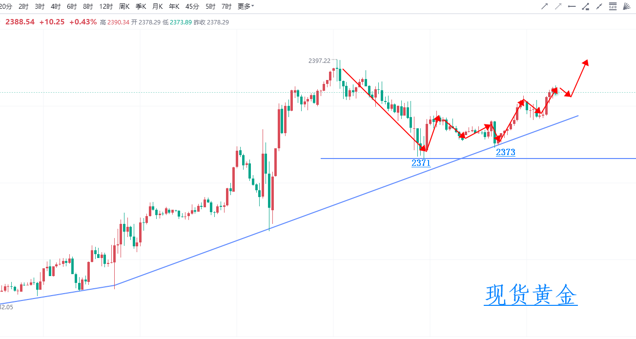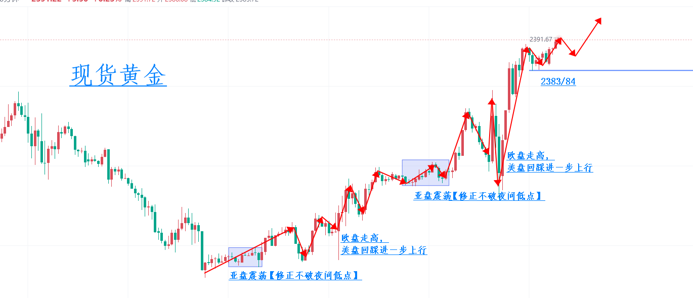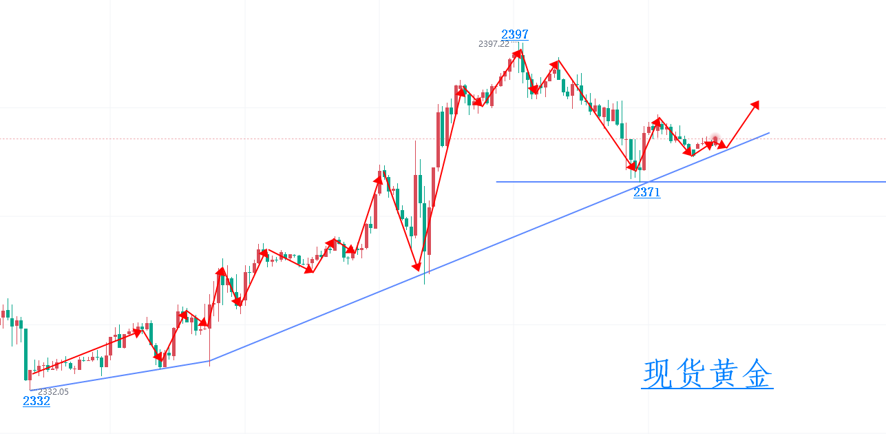 上一交易日回落后,本交易日布局主要注意几点: 一个是方面就是时间点,按照前面几个交易日的走势,欧盘的形态会在美盘延续,只要日内欧盘走强,晚盘就可以进一步看高; 另一个方面就是,走强的行情一定是不会二次破低的,只要亚盘早盘守住2371支撑,就跌不下去,午后盘面还将迎来上升,所以只有早盘不跌午后就是开多机会,早评中我们对此也是重点强调。 最后,我们对当前的走势要有一个明确的方向性的定义,打个不恰当比喻,就好比你开车从北京到广州,大方向都是向南开,但是途中不免有七转八绕,甚至逆向的情况,不可能直直的一个方向往前开。对应当前的盘面就是如此,大方向就是上升,回调也好,修正也罢,都是上升中的