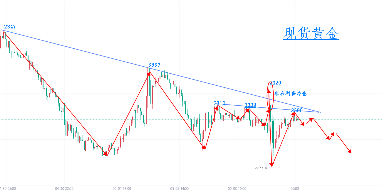 本交易日围绕2309压制,我们继续循环前面几个交易日的亚盘放空思路布局,但盘面价格最大回踩不过2298位置,空单入场点在2303/04位置,短线基本没有利润,盘面价格迟迟不能走出回落,空单不拿了,微利离场,静待非农! 北京时间周五20:30,投资者将迎来美国4月非农就业报告。在此前35次发布的非农数据中,有10份数据不及预期,25份数据优于预期。平均而言,在令人失望的数据方面,偏差为-0.92,强劲数据为1.42。数据发布15分钟后,如果非农就业数据低于市场共识,金价平均上升8.33美元。另一方面,若数据好于预期,金价平均下跌5.04美元。这一发现表明,投资者对弱于预期的非农数据的直接反